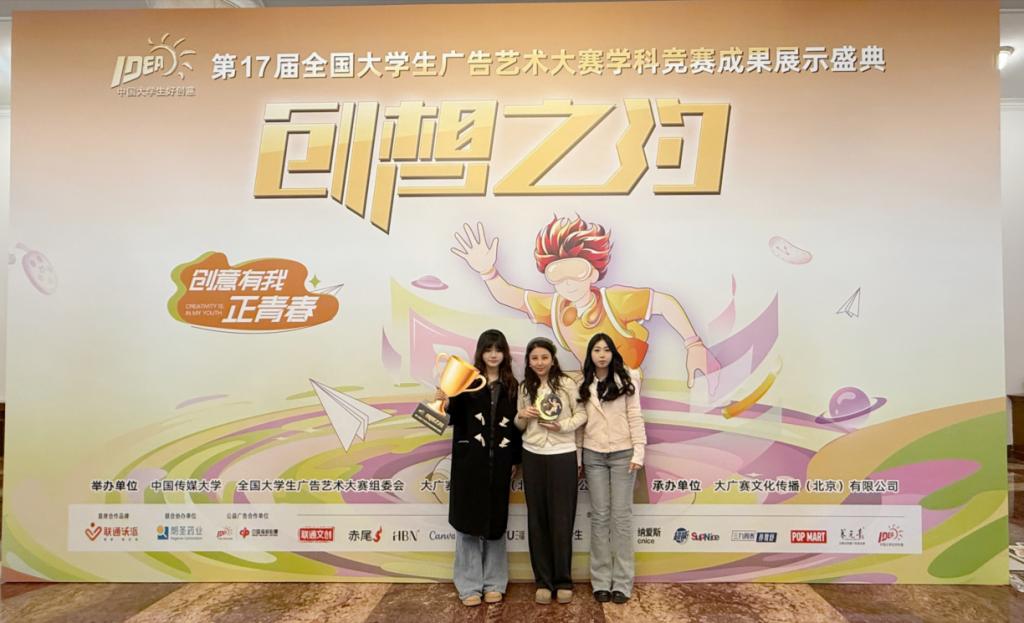 2025年12 月 6 日 - 7 日,第十七届全国大学生广告艺术大赛颁奖盛典在北京全国政协礼堂举行。我院在全国 1912 所高校、58 万件作品的角逐中,获全国平面类一等奖 1 项、三等奖 2 项,一等奖系我院第二次获该赛事全国最高奖,彰显学院人才培养实力。