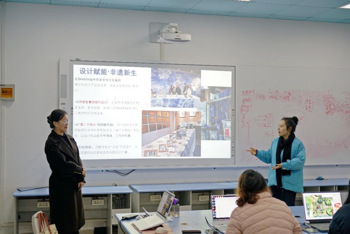 设计学院空间教研室主任赵海如与马克思主义学院鞠昕彤博士近日共同开展了一场别开生面的“双师同堂”教学活动。该活动以非遗工坊扎染艺术为案例,将SketchUp数字化设计教学与中华优秀传统文化传承相结合,展现了课程思政与专业课程深度融合的探索。